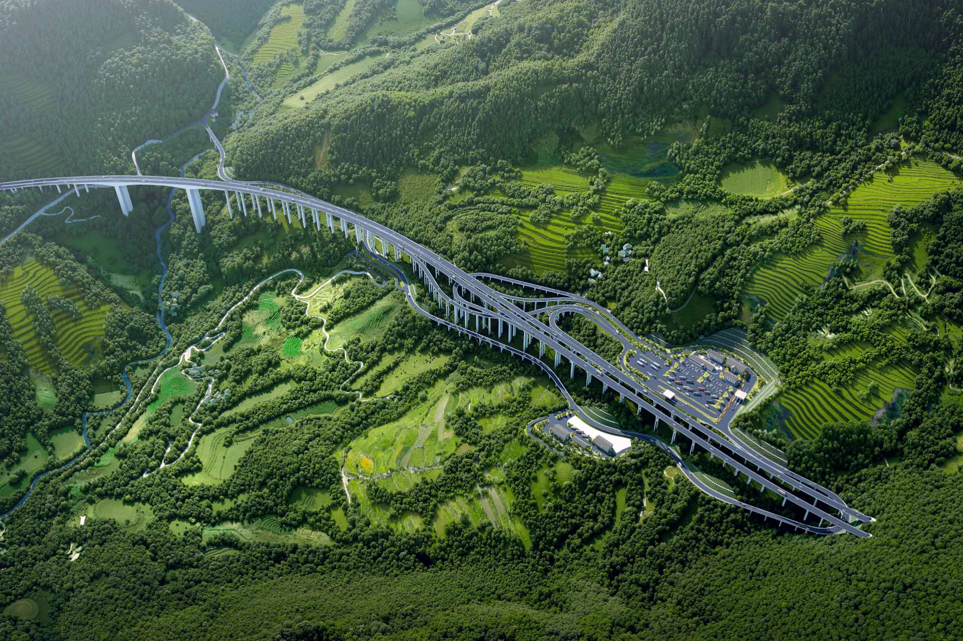格萨拉综合体互通工程,作为攀盐高速的重要节点工程,规模大、地质复杂,施工任务艰巨。工程主线全长2300米,匝道与连接线总长约3980米,路基填挖方量达62.7万立方米,占地266亩。建设内容包括1座主线桥、4座匝道桥、5座连接线桥,以及涵洞通道、停车区、养护区等配套设施。